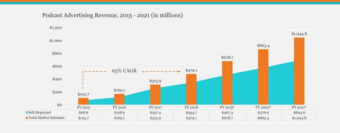 Podcasts vem se tornando cada vez mais populares, um levantamento da Interactive Advertising Bureau (IAB) e da PwC estima que o mercada estadunidense deve chegar a marca de 1 bilhão de dólares em 2021.
