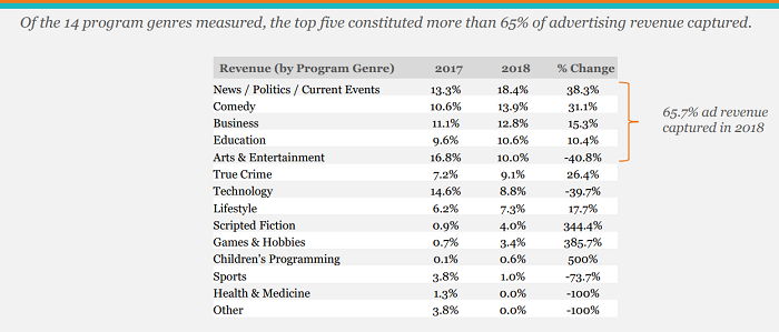 Somente em 2018 houve um crescimento de 53% em comparação com 2017. A maior receita veio de setores ligados a notícias e política com 18,4% do total, seguido vem comédia com 13,9%, negócios com 12,8%. Artes e Entretenimento aparece na 5ª posição com 10%.